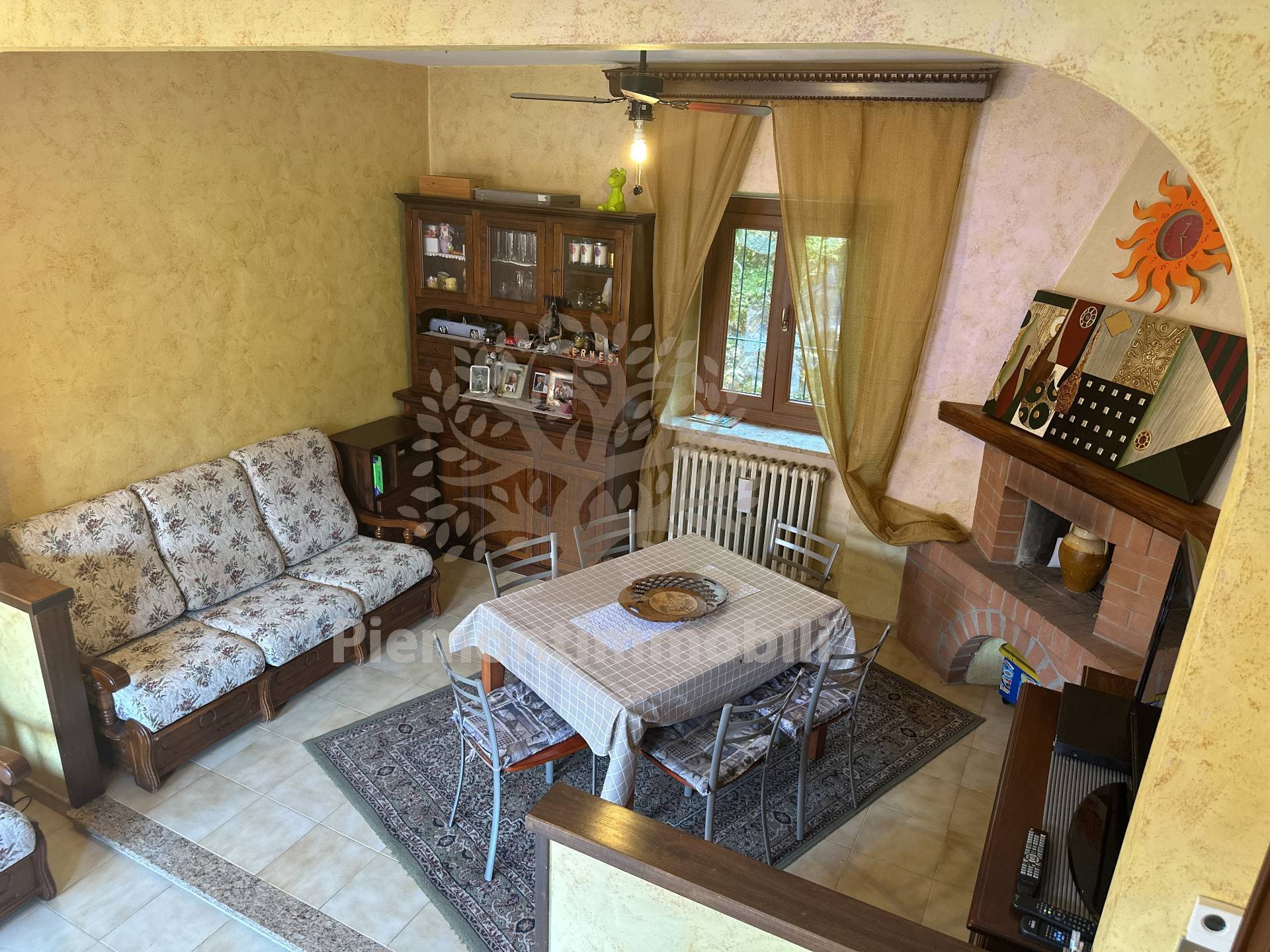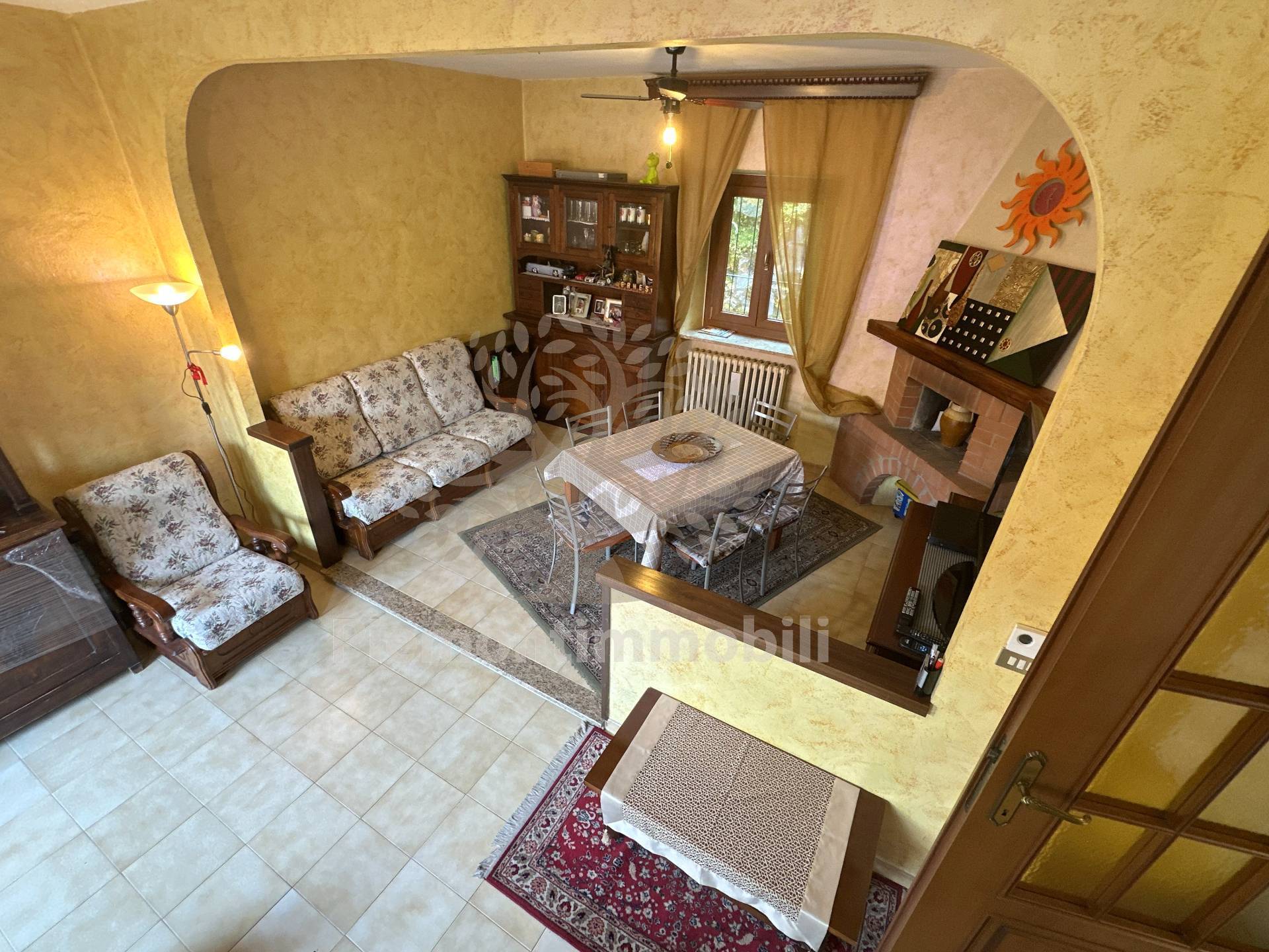 Ingresso sulla zona giorno composta da un ampio soggiorno con camino, cucina e bagno.