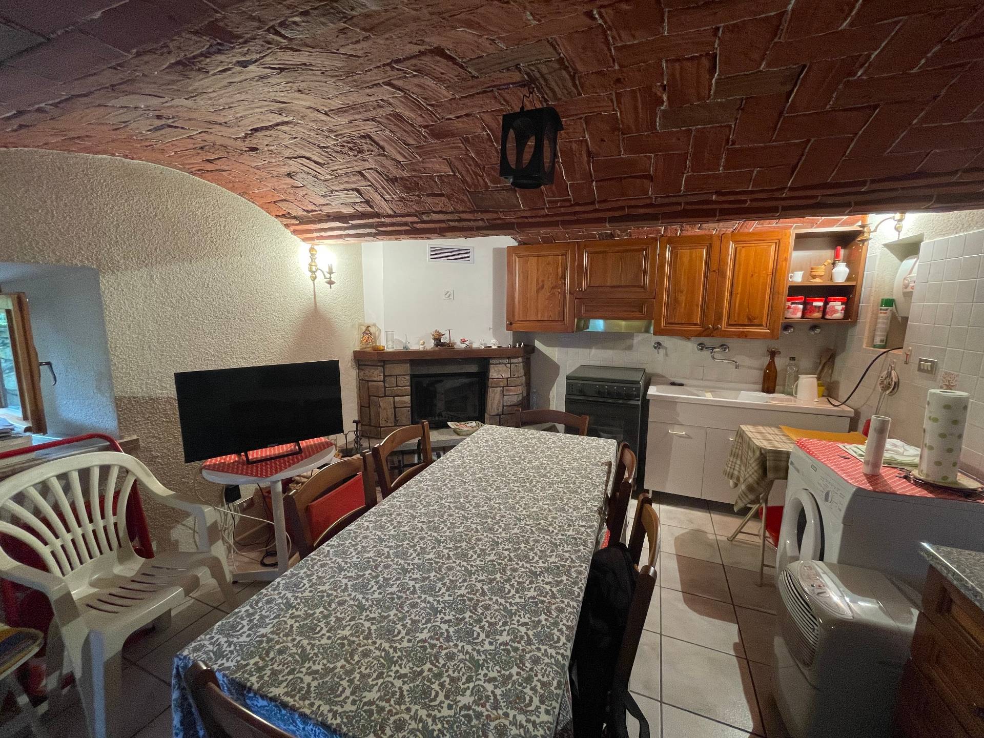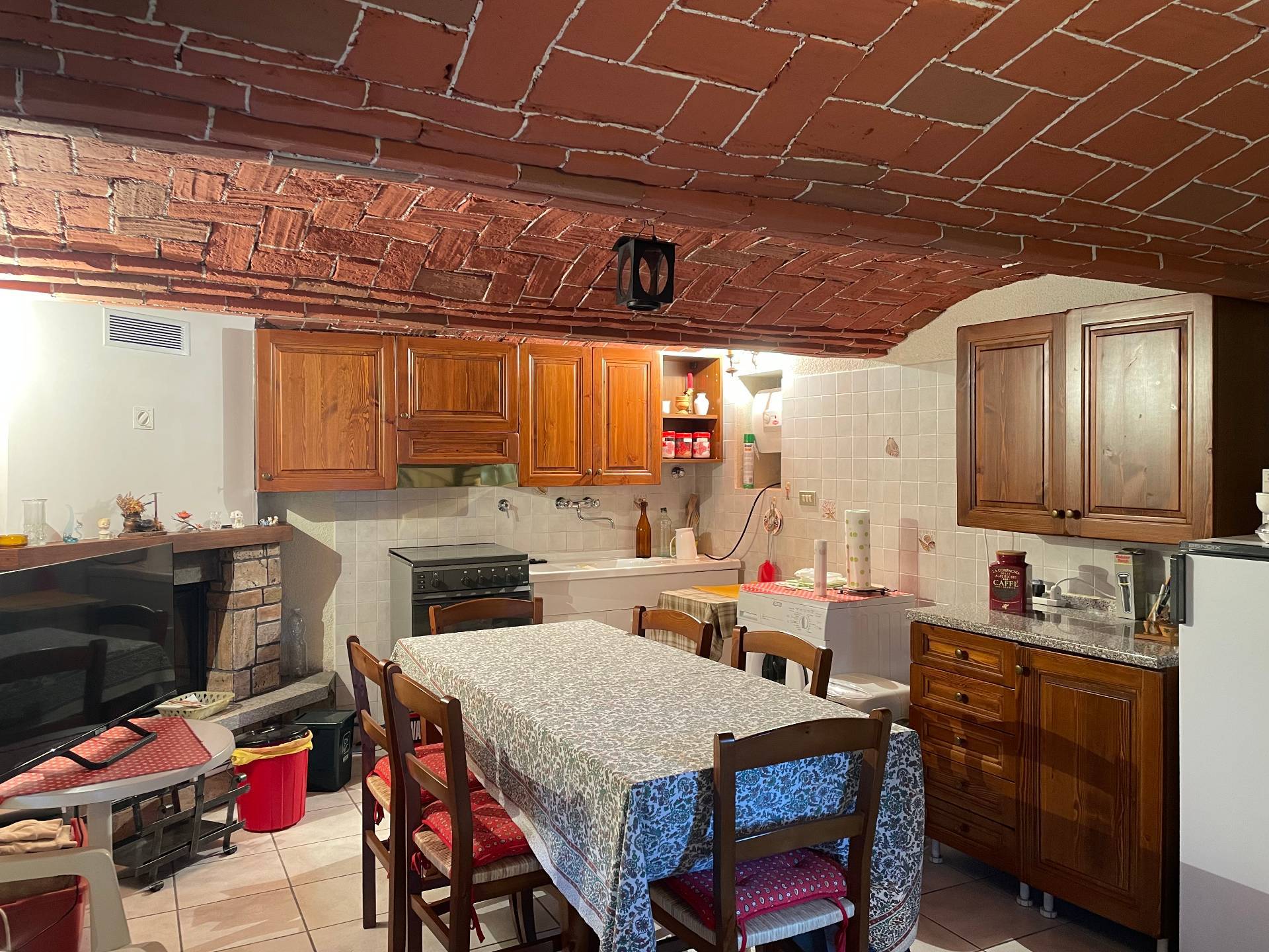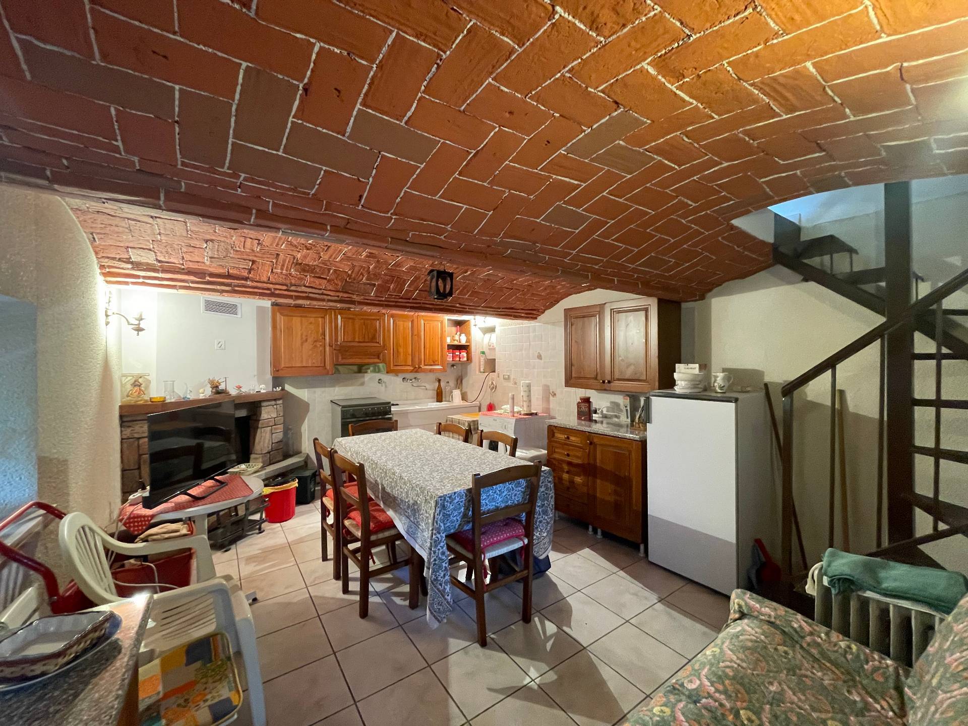 Al piano terra, una cucina caratteristica con splendidi voltini in mattoni e camino funzionante crea un’atmosfera calda e intima. Una scala a chiocciola collega i piani superiori.