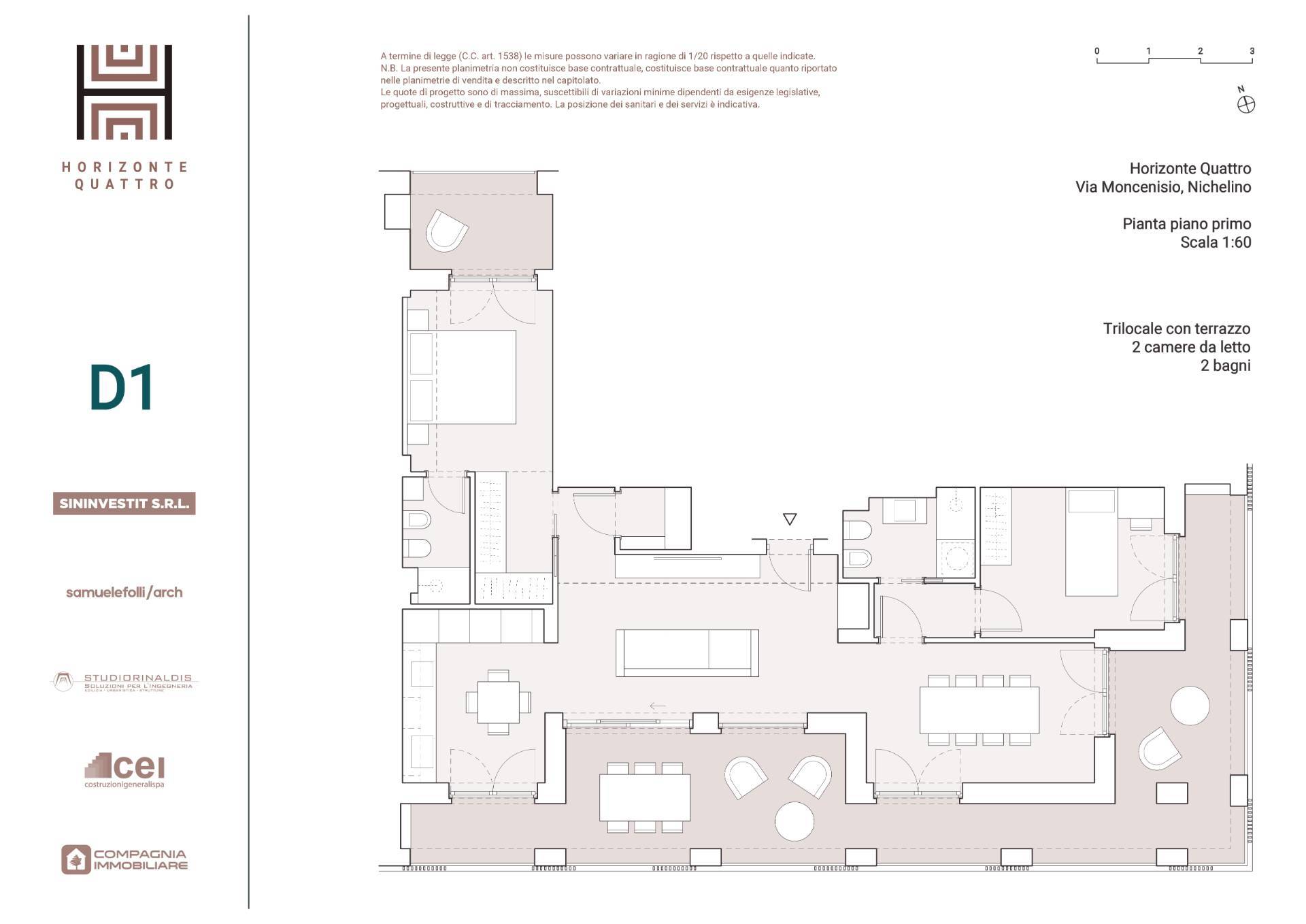 UNITA' D 1 ingresso su disimpegno sala da pranzo ,zona relax , cucina abitabile con accesso sul terrazzo angolare ; zona notte con 2 camere e doppi servizi oltre ad utile ripostiglio. Il tutto impreziosito da una loggia coperta godibile.