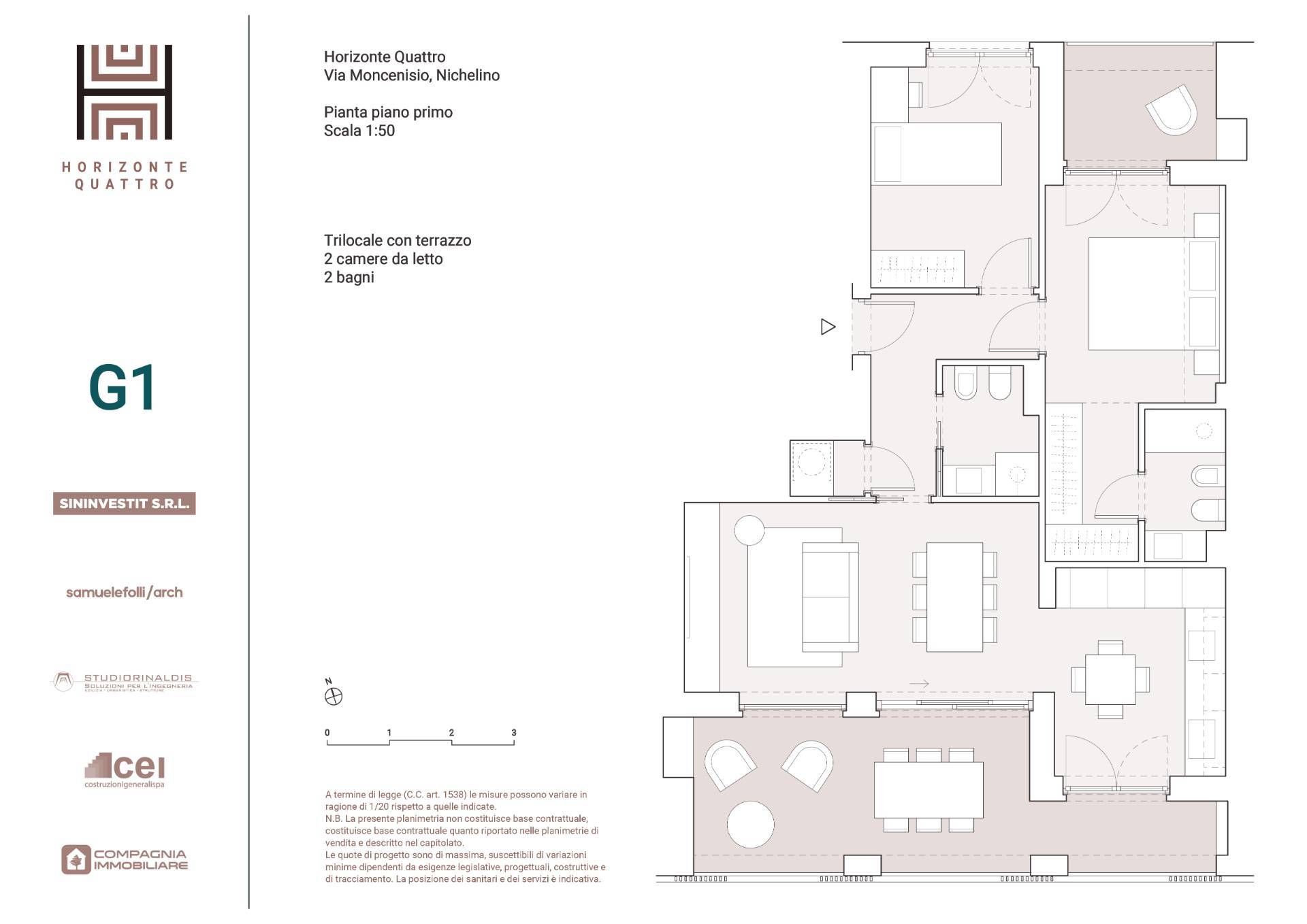 UNITA' G 1 ingresso su disimpegno soggiorno, cucina abitabile con accesso sul terrazzo; zona notte con 2 camere e doppi servizi oltre ad utile ripostiglio. Il tutto impreziosito da una loggia coperta godibile.